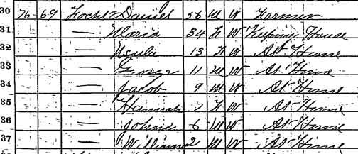 Daniel Focht household, 1870 U.S. census, Auglaize County, Ohio (Union Township), p. 526A, lines 30-37, dwelling 76, family 69, National Archives Microfilm M-593, Roll 1172