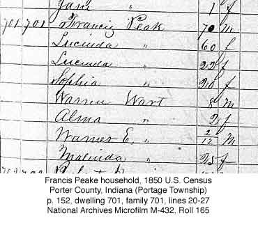 Francis Peak household, 1850 U.S. census Porter County, Indiana (Portage Township, Porter City) p. 152, dwelling 701, family 701, lines 20-27 National Archives Microfilm M-432, Roll 165