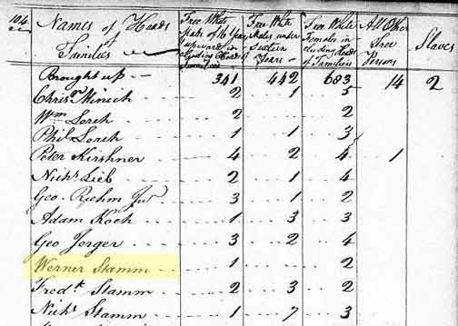 Werner Stamm household, 1790 U.S. census, Berks County, Pennsylvania (Bern Township), p. 104, National Archives Microfilm M-637, Roll 8
