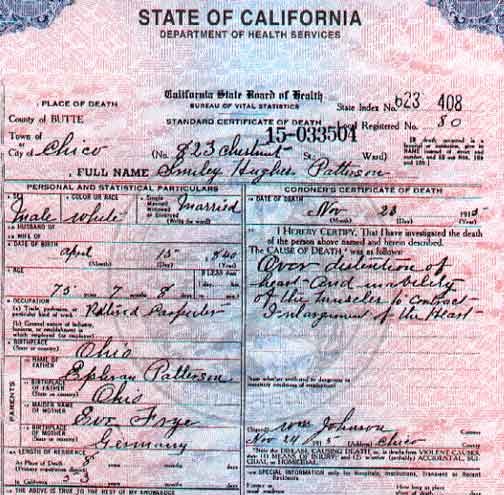 Smiley Hughes Patterson death certificate, File no. 15-033504, California Department of Health Services, Office of Vital Records, Sacramento, California